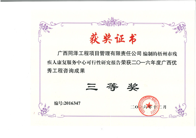 梧州市殘疾人康復(fù)服務(wù)中心可行性研究報告榮獲2016年度廣西優(yōu)秀工程咨詢成果三等獎